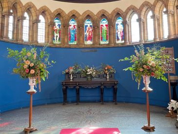 Arches, pedestal arrangements, entrance flowers, pew ends, aisle decorations, and welcome board flowers – thoughtfully designed to harmonise with your ceremony space